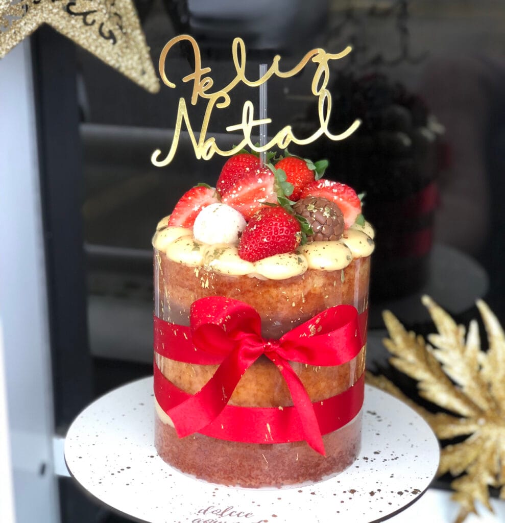 DECORAÇÃO PADRÃO COM FITA VERMELHA, BRIGADEIROS, MORANGOS E TOPO “FELIZ NATAL”.